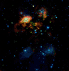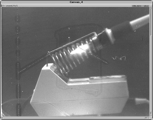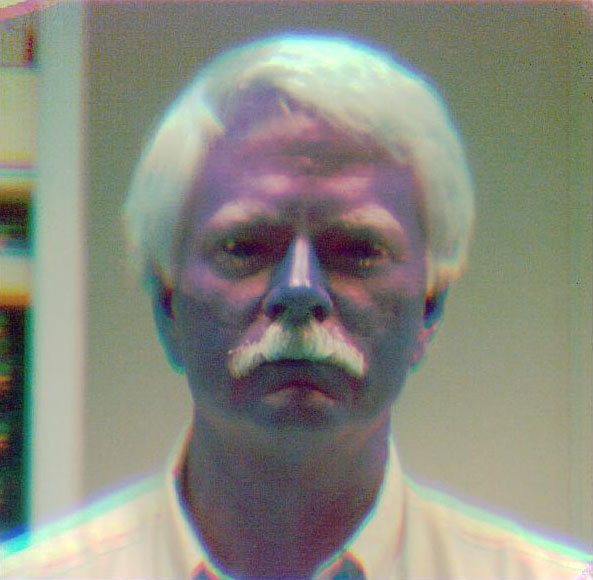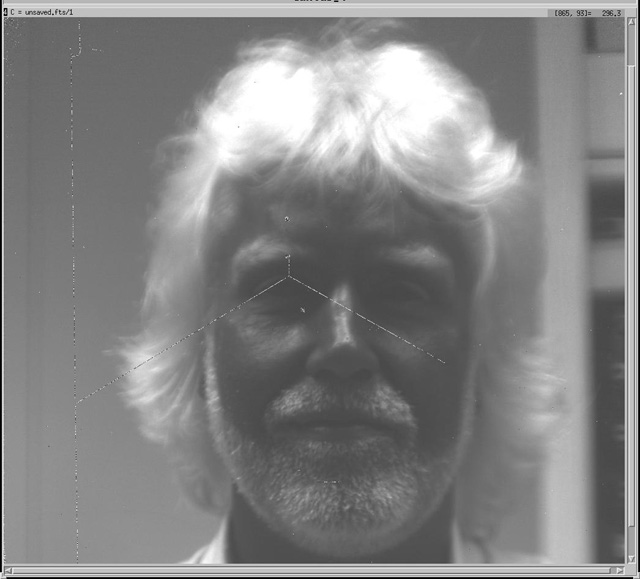 NGC 253 three wavelength false color image. In this image of the galaxy NGC253 three seperate exposures were taken at roughly 1, 1.5 and 2.2 microns and then color coded and combined to produce this image. Produced by Arne Henden. Star formation area W3 in three colors at J, K and L'. Mandatory Soldering Iron Image at K(2.2 microns). One of the first images out of every new infrared array or camera has to be a soldering iron. This image was taken at 2.2 microns. At these wavelengths everything looks pretty normal except for the glowing tip of the iron which is not seen to glow when viewed with the eyes. MKIR Owner Doug Toomey at K. Picture of Doug Toomey taken at 2.2 microns. No his hair is not white yet. At these wavelengths hair is very reflective and skin very absorbtive. The Y shaped line over the right eye is a crack in this engineering array. U.S.Naval Observatory Astronomer Arne Henden Three wavelength false color image at J H and K. |