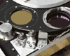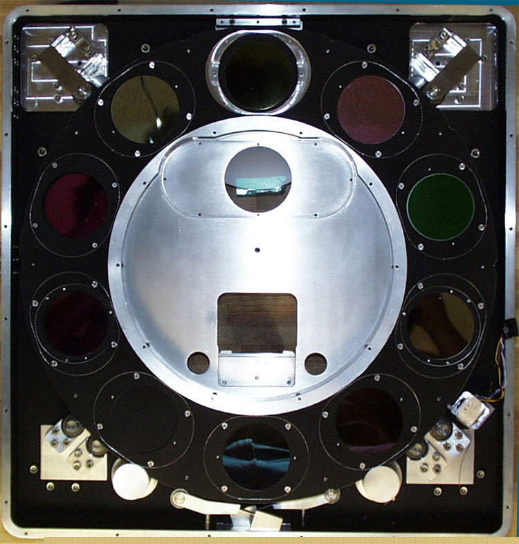 Picture of Filter Wheel assembly. Close up of filters. ASTROCAM on the Naval Observatory 1.55 Meter Astrometric Telescope In Flagstaff. Seen are the cryostat on the left behind the cryostat electronics and the Electronics rack on the right holding the array power supplies, temperature controller and the terminal server. The VME based control computer is connected remote via fiber. Top of cryostat showing input light baffle and detector mount. Inlet Baffle and detector mount(behind).